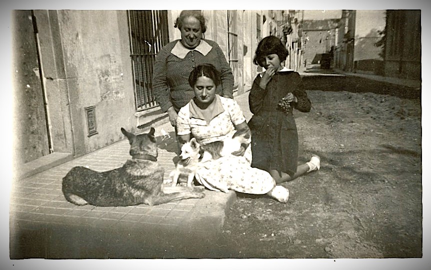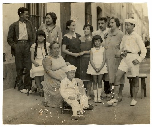 Maria Ramoneda, asseguda, amb veïns i familiars, ca 1949 (foto Arxiu Gómez-Fontanills)
